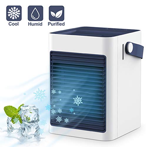 Evaporative Swamp Air Cooler, 3 in 1 Perfect Mini Table A/C Fans for Office/Night Table/Baby’s Room/Car/Tent, White& Blue